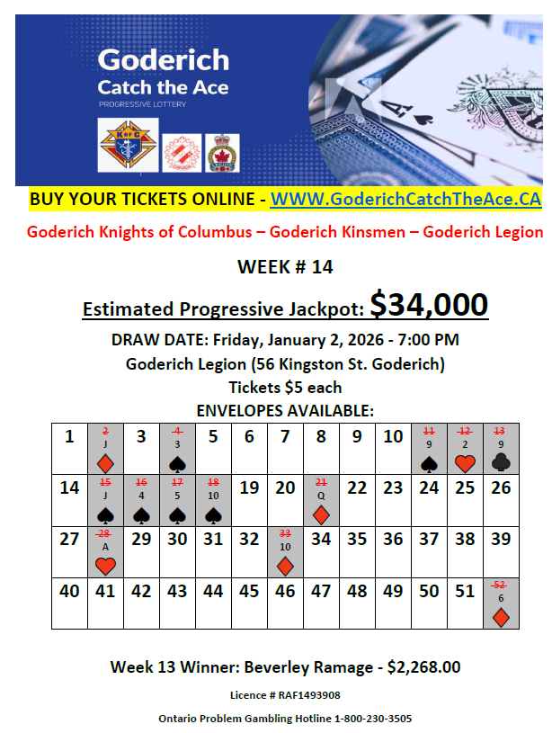 Congratulations to Beverley Ramage, the week 13 winner. The estimated jackpot for next draw is $34,000. The next draw is Friday January 2nd at the Goderich Legion at 7:00 pm. Come out and see it in person!